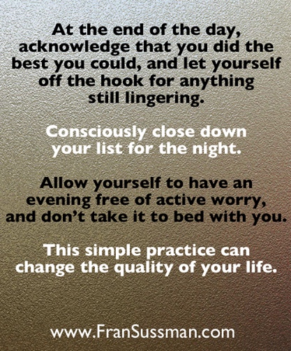 3. At the end of the day, acknowledge that you did the best you could, and let yourself off the hook for anything still lingering. Think of 3 things for which you’re grateful today, and then consciously close down your list for the night. This simple practice can change the quality of your life.